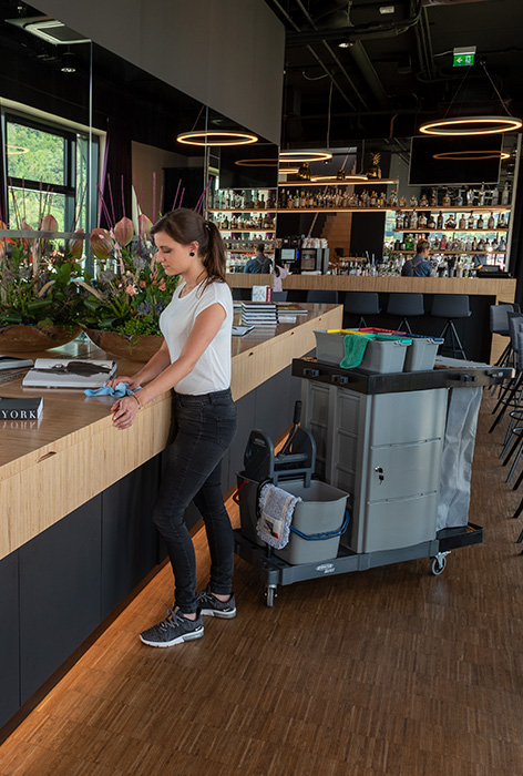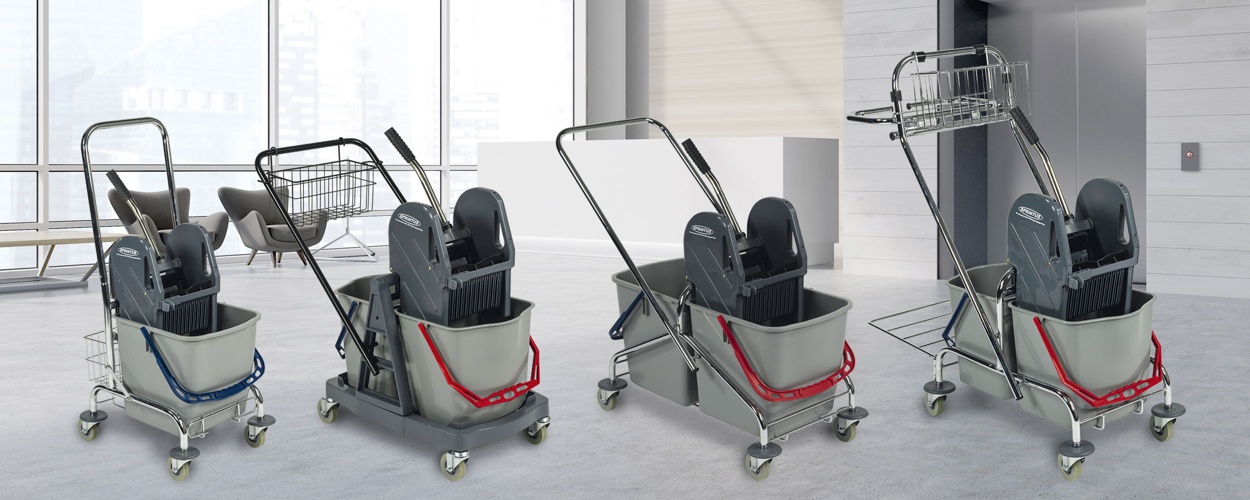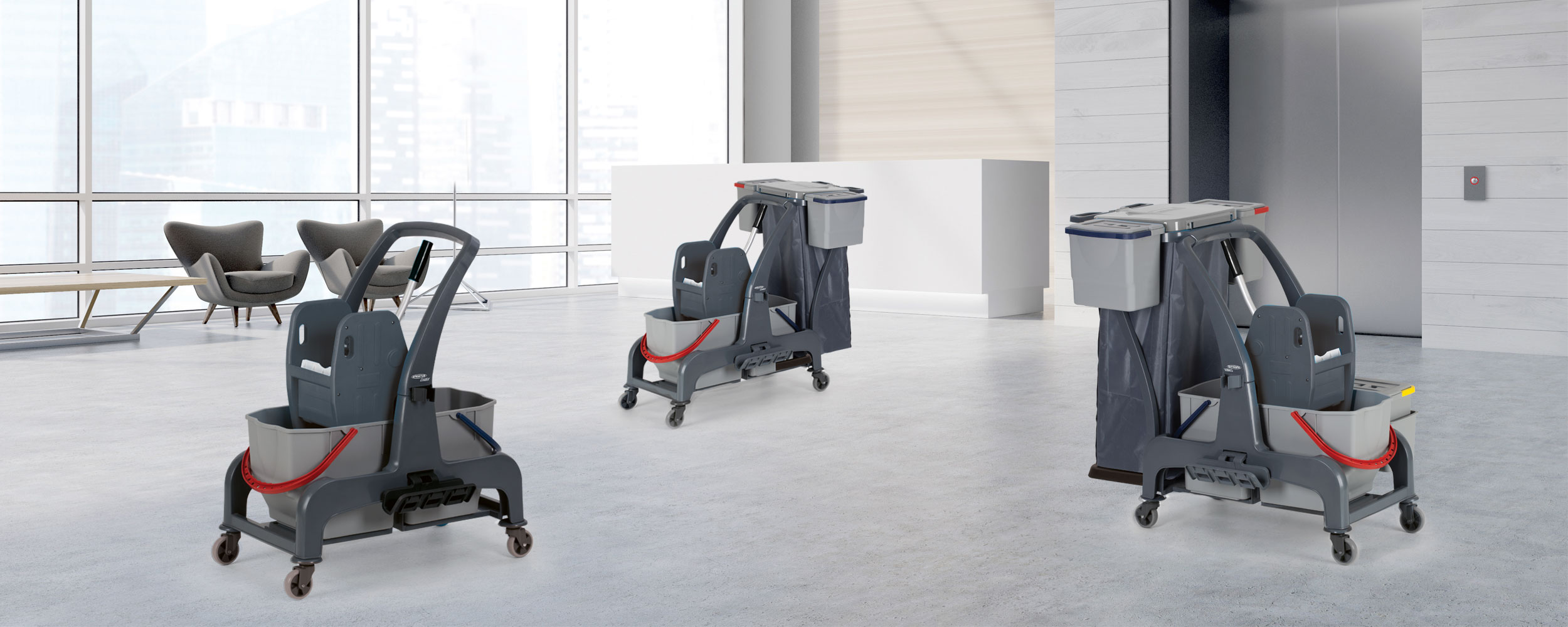 Erweiterbarer Systemwagen in drei Ausführungen. Praxisorientierte Lösungen in Profiqualität mit hochwertiger Verarbeitung, stabiler Mopp-Presse und gummierten Lenkrollen.