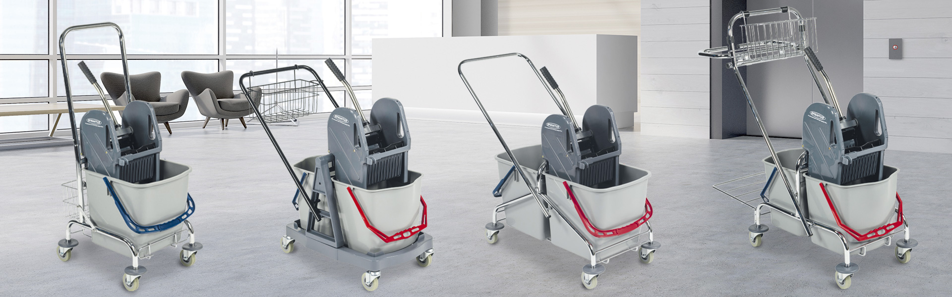 Zwei farblich getrennte Wischeimer und robuste Doppelbacken-Mopp-Presse.