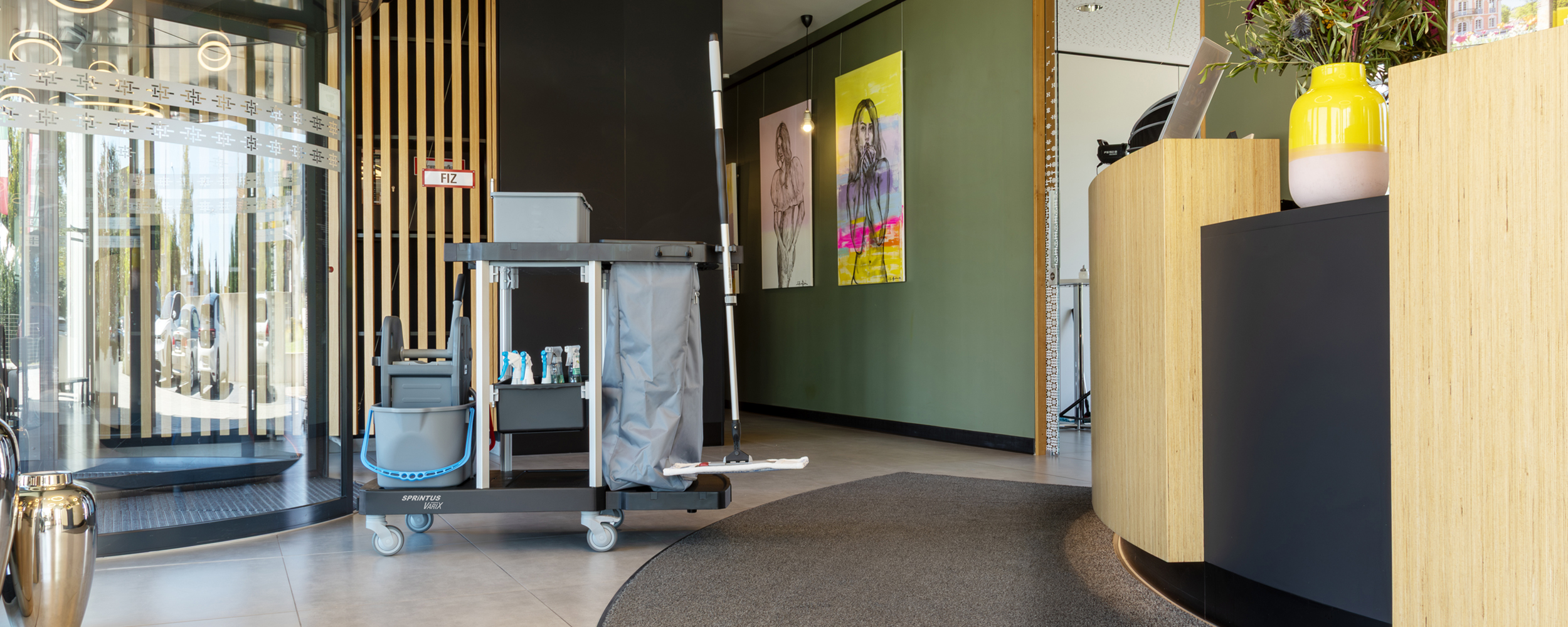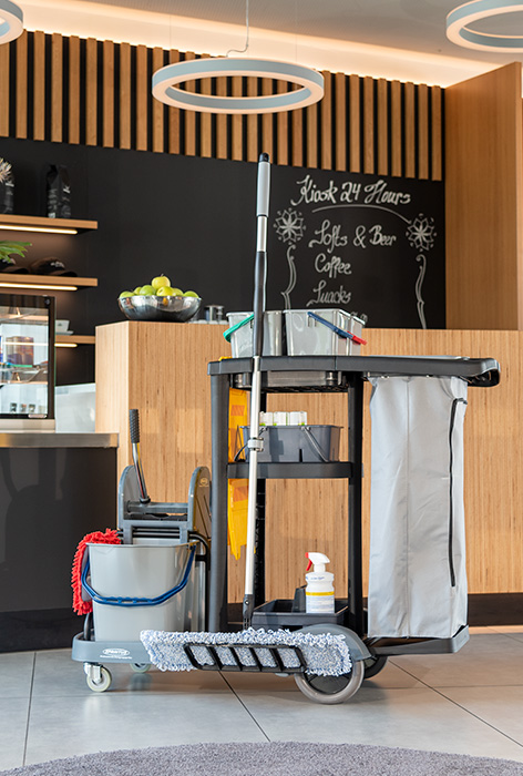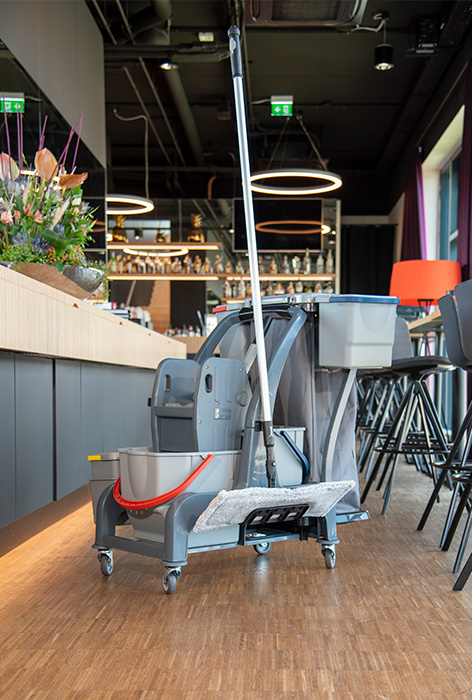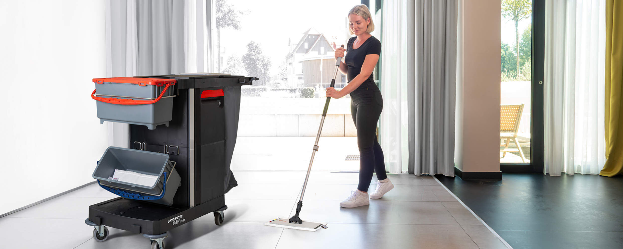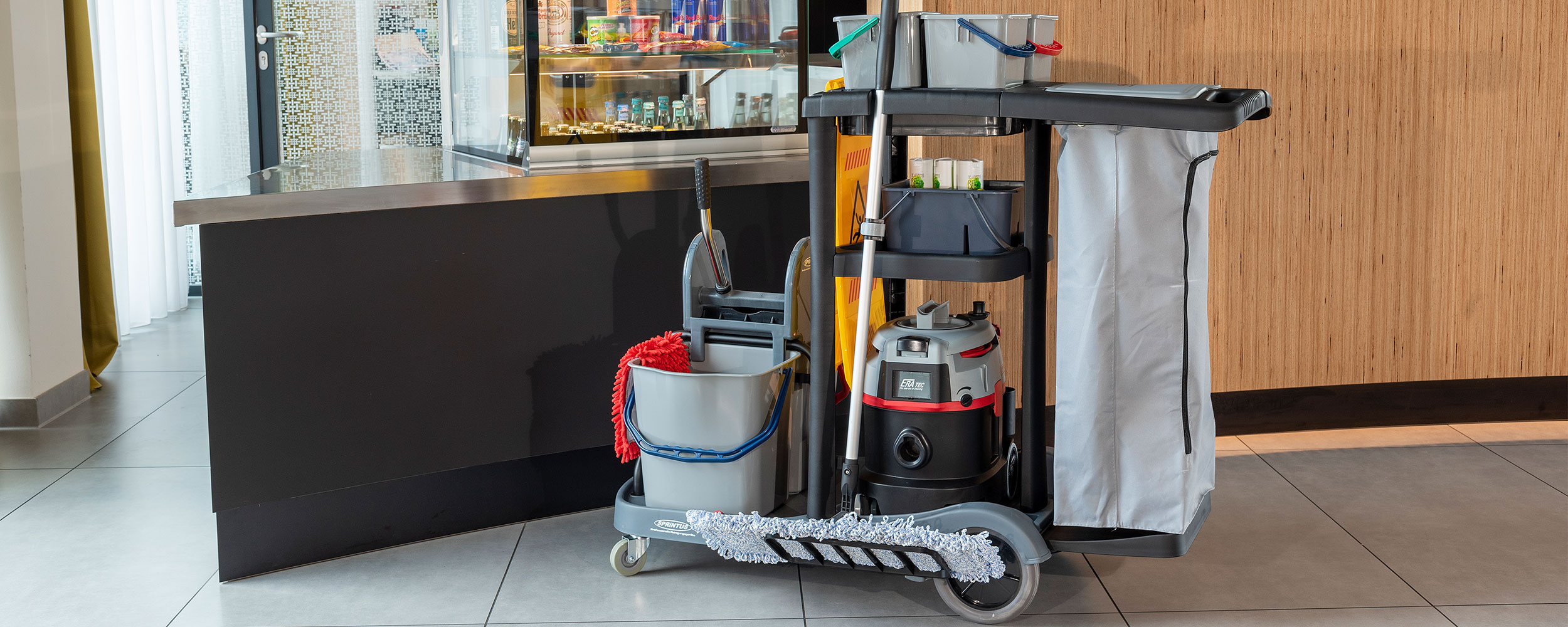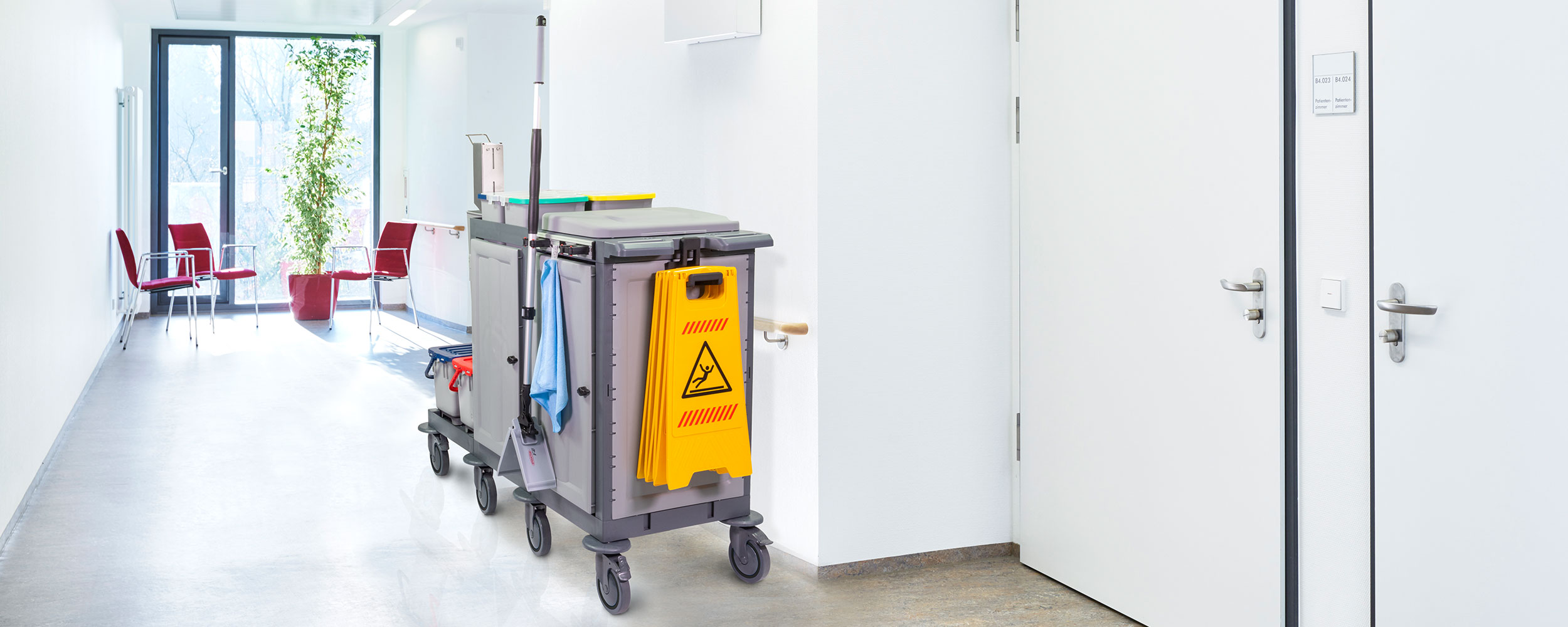 Für die Flur-, Zimmer- und Badreinigung in öffentlichen Einrichtungen, Hotels, Pensionen, Krankenhäusern und der Altenpflege. Farblich getrennte Wischeimer, Halterung für Wäsche-/ Müllsack.