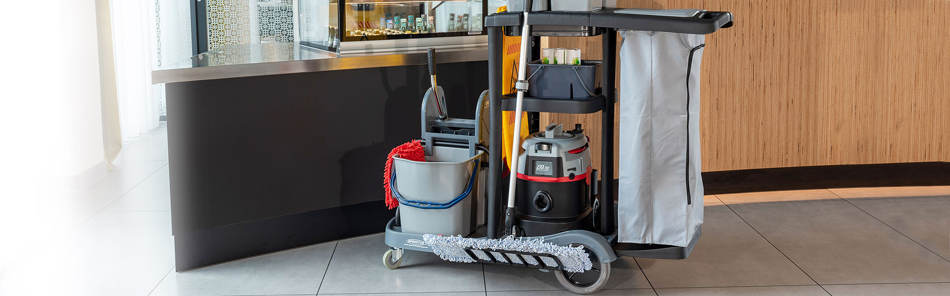 Ein Mopp oder Besen kann sicher im integrierten Halter fixiert werden. Für das Warnschild ist eine gesonderte Halterung am Rahmen integriert.