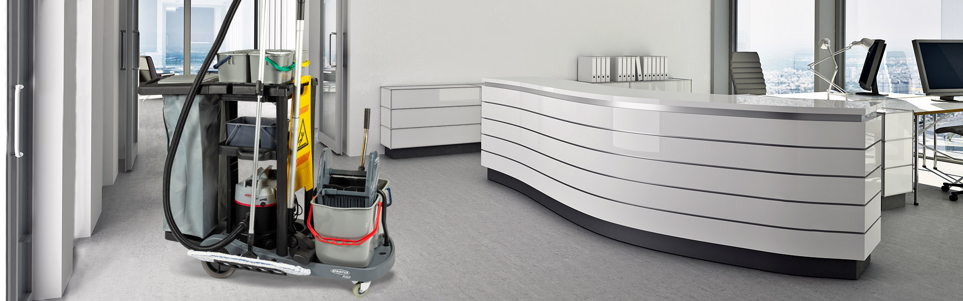 Serienmäßig wird der PuriX mit vier Eimern, einer seitlichen Moppablage, geräumigem 120 Liter Wäsche-/Müllsack und einer Doppelbacken-Mopp-Presse ausgeliefert. Am Wagen kann eine Medusa Akkukehrmaschine mitgeführt werden.