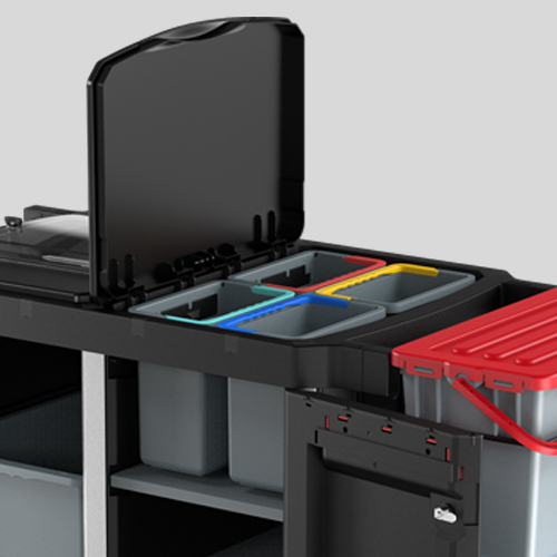 Dank glatter, leicht desinfizierbarer Oberflächen und 4-Farbcodierung erfüllt die Serie strengste Hygienestandards. Praktische Features wie klappbare Deckel, großzügiger Stauraum und multifunktionale Halterungen machen die Arbeit effizient und komfortabel. Robuste Lenkrollen mit Fadenschutz und Bremse garantieren höchste Stabilität und Mobilität.