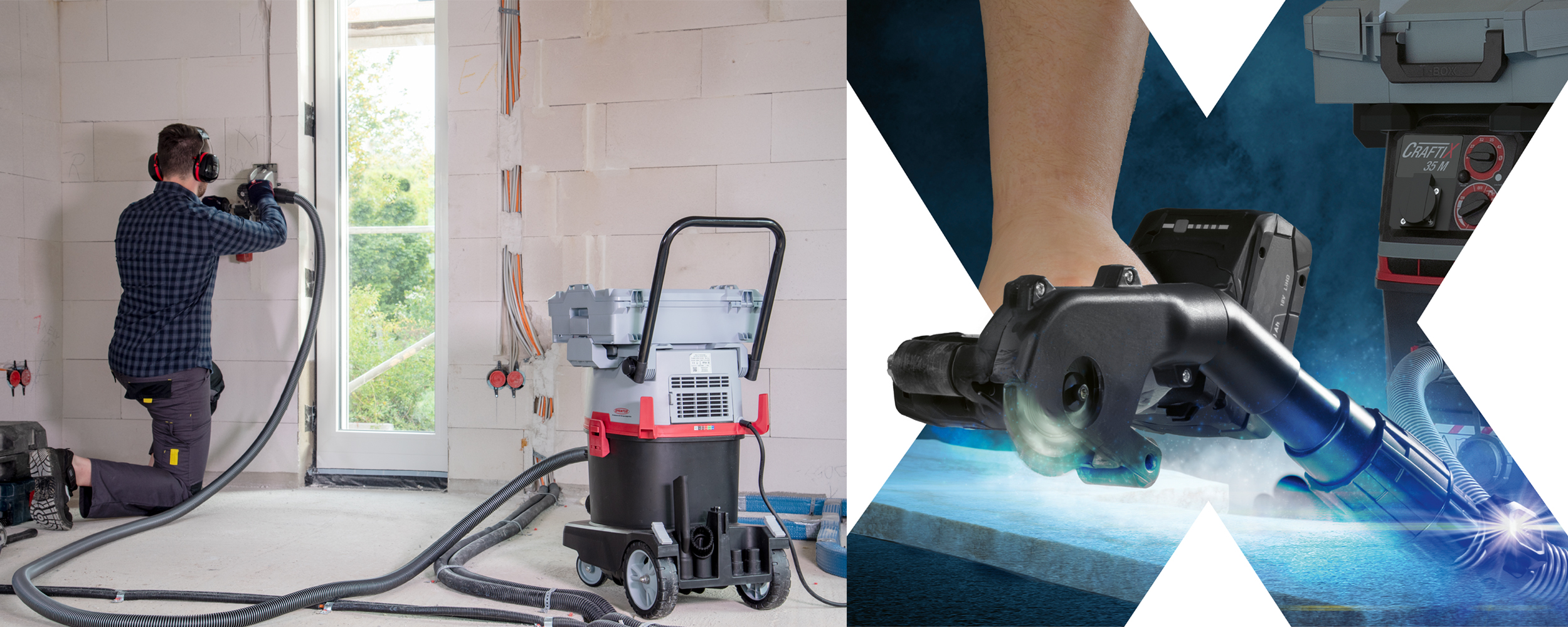 Wood dusts, paint dusts or other dusts – the two safety vacuum cleaners CraftiX 35 M and 50 M absorb hazardous Class-M dusts before they enter breathable air. Due to the standard anti-static equipment, the two M safety vacuum cleaners are ideal for extracting large amounts of fine dust directly on the power tool.