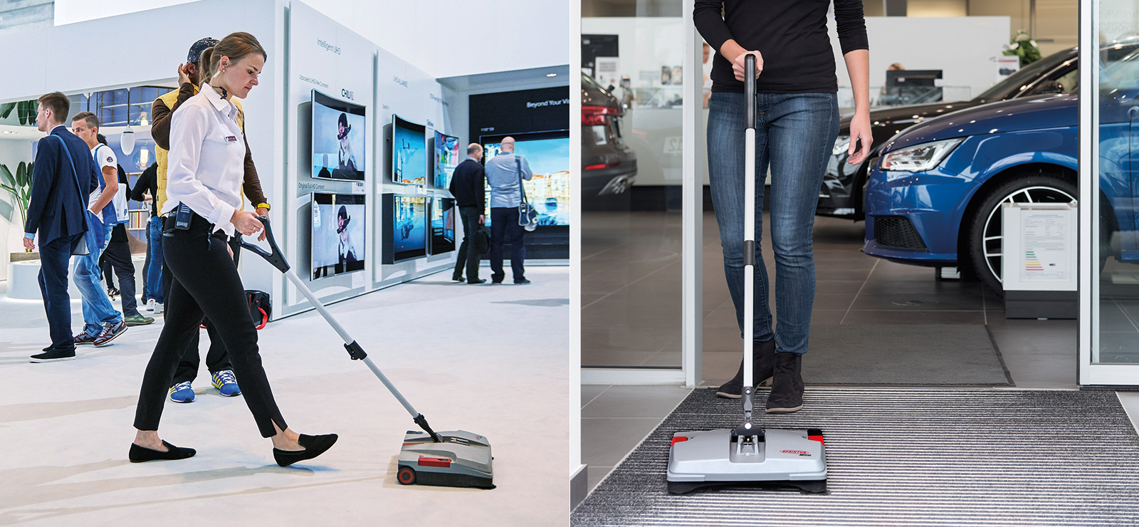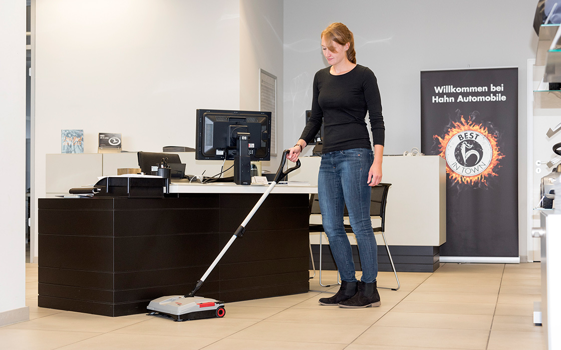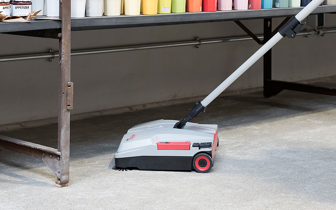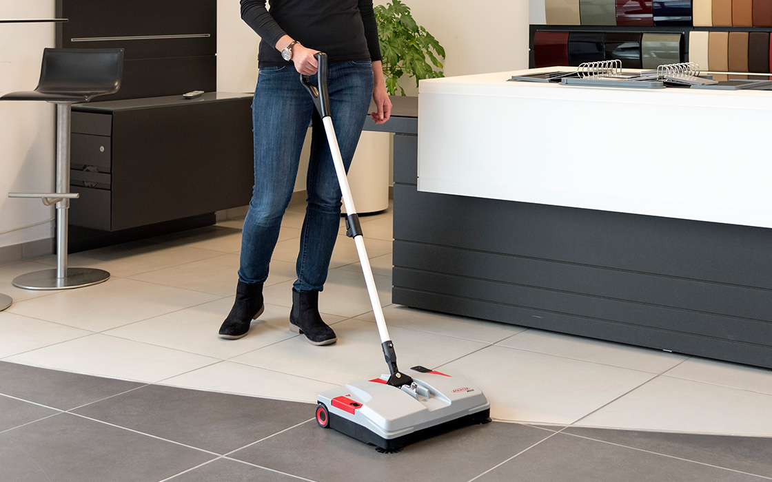 Balai mécanique industriel avec batterie rechargeable pour un nettoyage rapide, silencieux et sans fil de toutes les surfaces, à l’intérieur comme à l’extérieur.