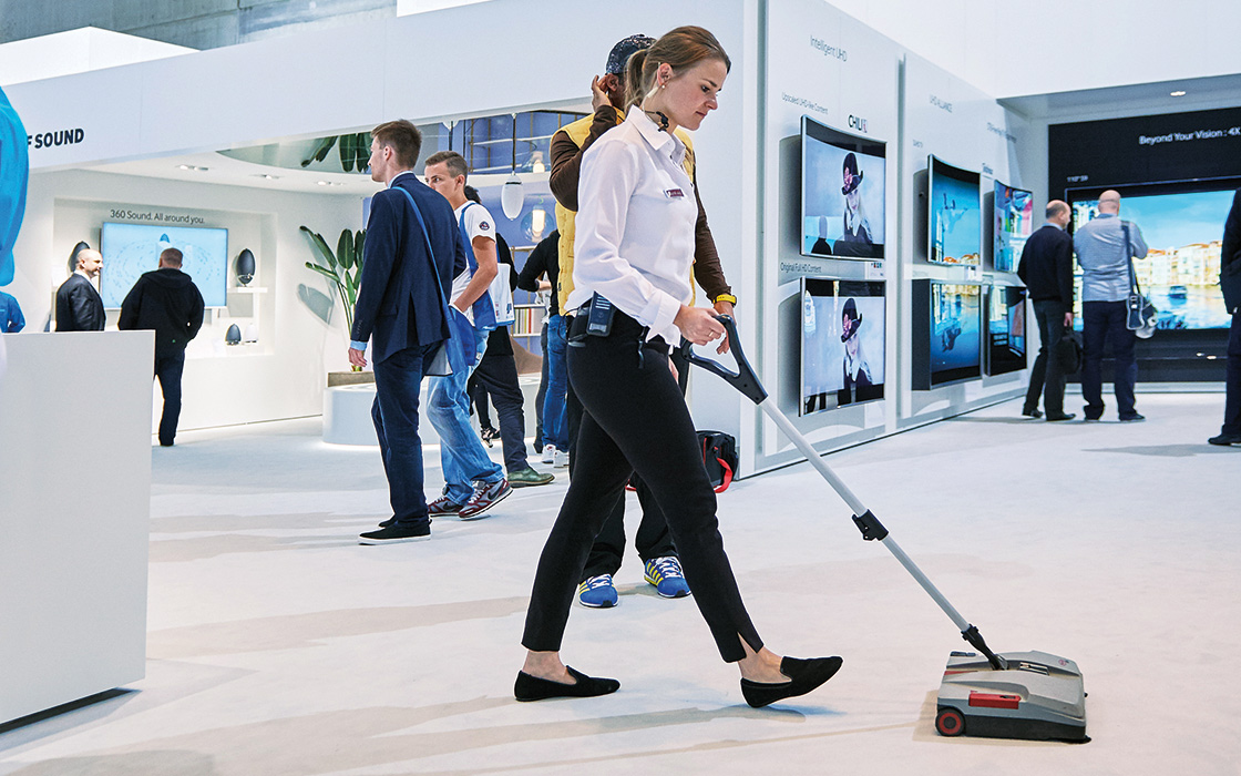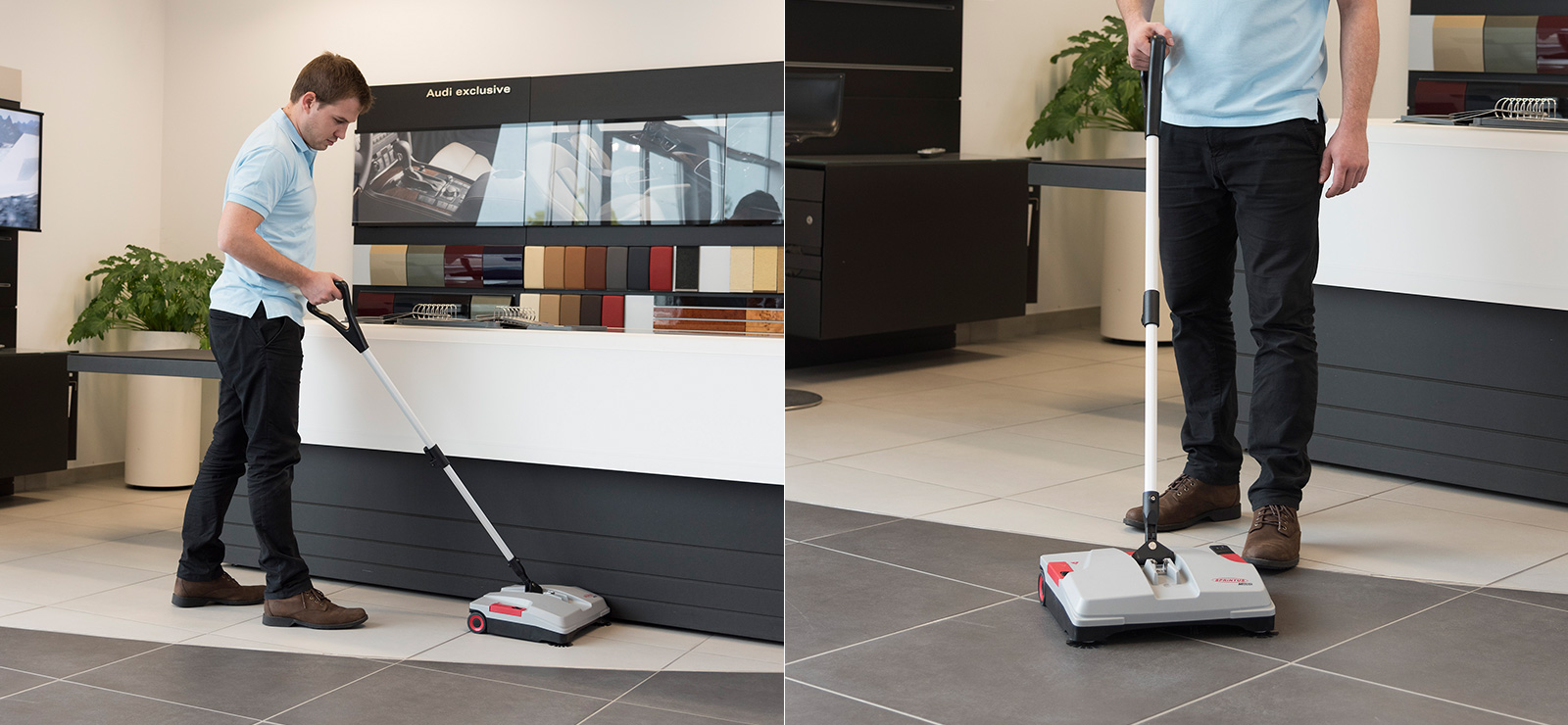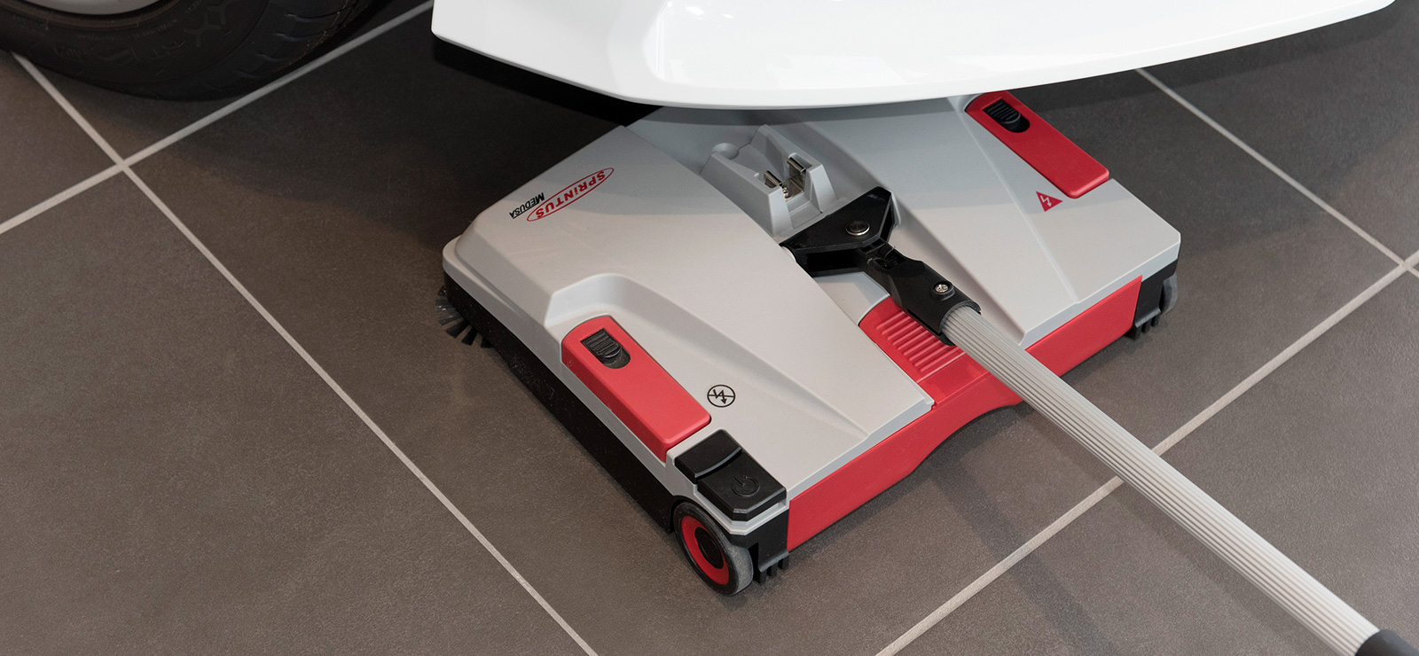 Balai mécanique industriel avec batterie rechargeable pour un nettoyage rapide, silencieux et sans fil de toutes les surfaces, à l’intérieur comme à l’extérieur.